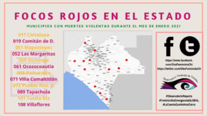 El Observatorio Feminista contra la Violencia a las Mujeres de Chiapas dio a conocer que, enero de 2021 abrió con un aumento de violencia feminicida, 18 muertes violentas de mujeres, 9 tentativas de feminicidio y un crecimiento progresivo de violencia familiar.