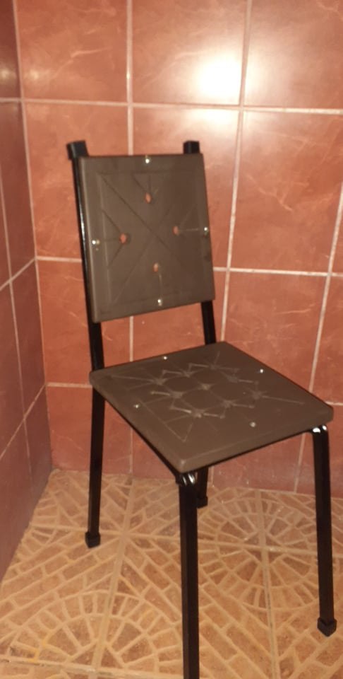 Víctor en la celebración de su cumpleaños. A la derecha una de las sillas que fabrica con materiales reciclados
