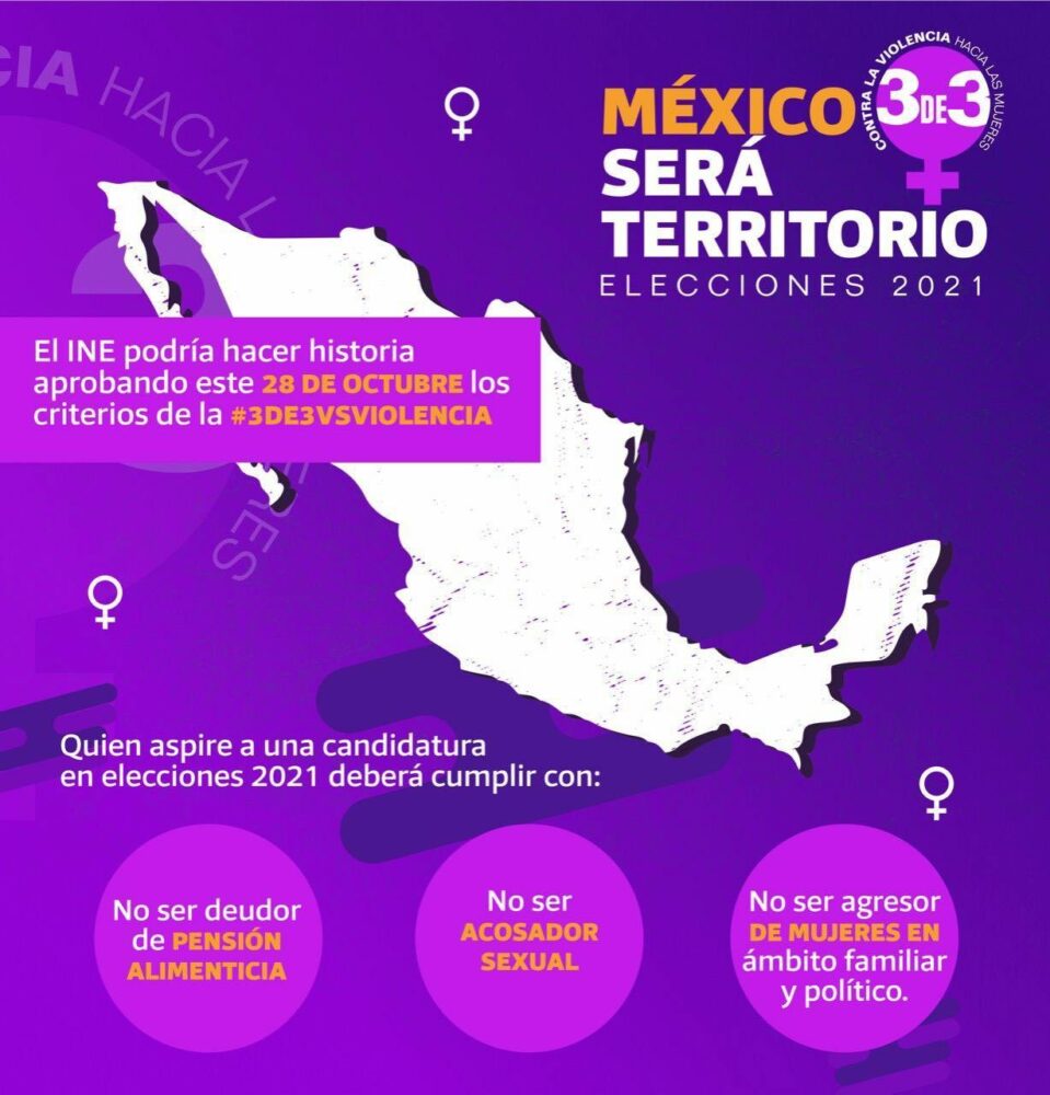Las Constituyentes CDMX Feministas han impulsado desde el 2018 la iniciativa 3 de 3 Contra La Violencia Hacia Las Mujeres que pretende visibilizar y combatir las violaciones cometidas por razón de género dentro de las propias instituciones públicas; dos años después, este 28 de octubre de 2020, gracias al empuje y fuerza de las redes feministas, el Instituto Nacional Electoral (INE) finalmente aprobó la inclusión de los criterios propuestos en esta iniciativa.