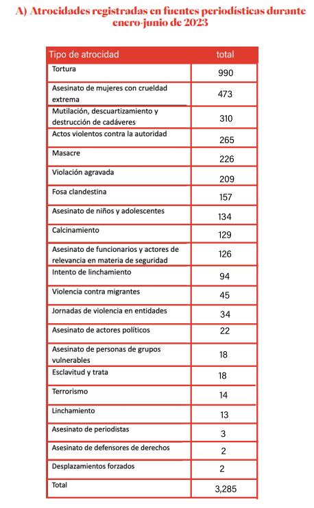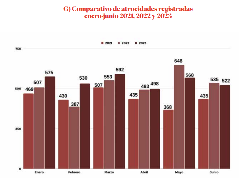 En el periodo enero-junio de 2023 revisaron un total de 2 mil 822 notas periodísticas sobre eventos que pueden catalogarse como atrocidades; de las cuales resultaron 3 mil 285 atrocidades y 6 mil 460 víctimas.