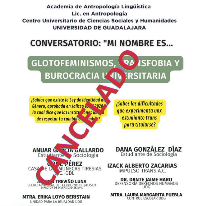 Sin embargo, pese a que este conversatorio fue planeado con al menos tres meses de anticipación, autoridades del Centro Universitario de Ciencias Sociales y Humanidades (CUCSH) en su sede Belenes (espacio donde se llevaría a cabo) cancelaron la actividad, argumentando que “no habría espacio ni lugar en su centro porque no son los tiempos políticos”. Sin mayores explicaciones, aseguraron las personas organizadoras, “censuraron a la comunidad trans en Guadalajara”.
