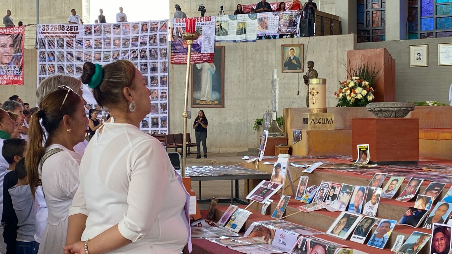 Al arribar al templo, las fichas y lonas que portaban las familias buscadoras fueron colocadas en las escaleras frente al altar para obtener la bendición, pero también para que las personas presentes las vieran, esto con la esperanza de obtener información sobre su paradero.