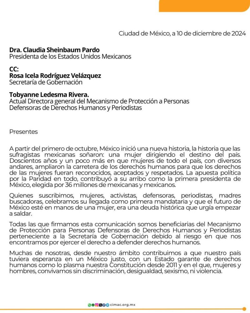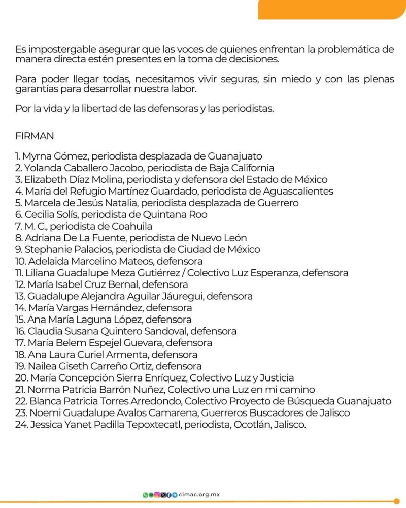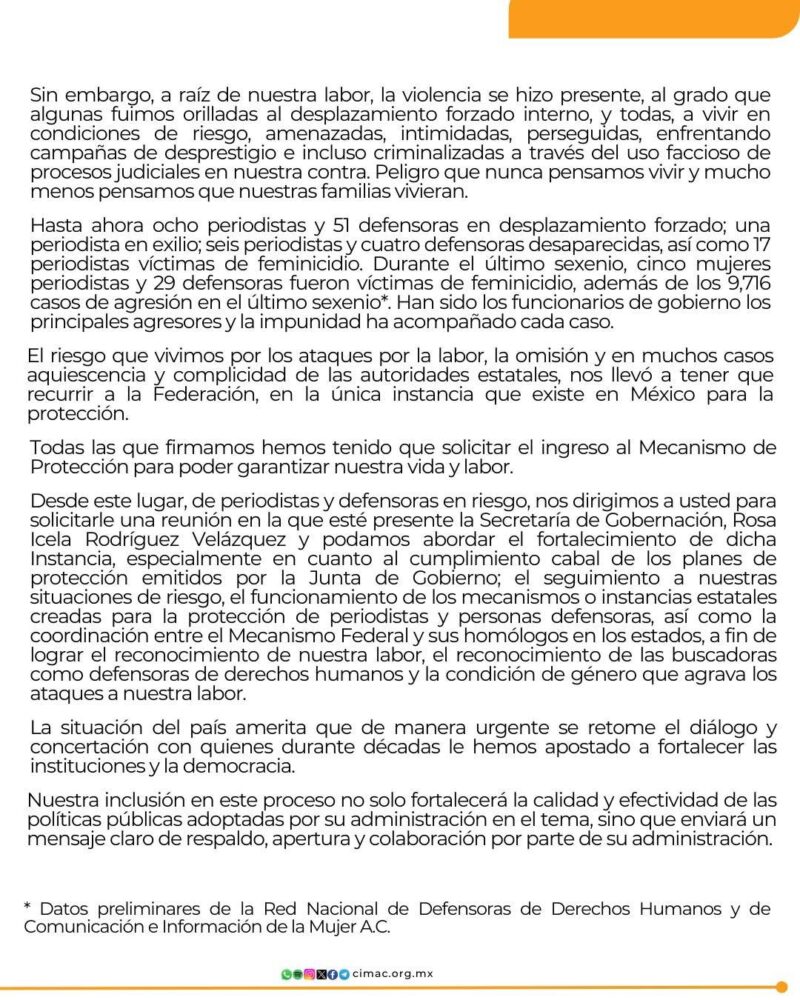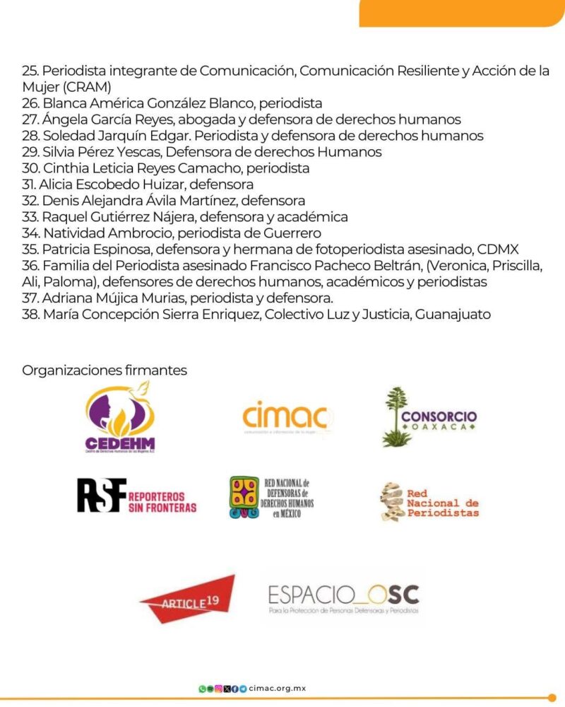Es por esto que periodistas, abogadas, defensoras de derechos humanos y organizaciones como el Centro de Derechos Humanos de las Mujeres (CEDEHM), Comunicación e Información de la Mujer A.C. (CIMAC), Consorcio Oaxaca, Reporteros Sin Fronteras, la Red Nacional de Defensoras de Derechos Humanos en México (RNDDHM), la Red Nacional de Periodistas, Artículo 19, Espacio de Organizaciones de la Sociedad Civil para la Protección de Personas Defensoras de Derechos Humanos y Periodistas (Espacio OSC), entre otras, redactaron una carta dirigida a la Presidenta Claudia Sheinbaum Pardo, a la Secretaría de Gobernación Rosa Icela Rodríguez y a la Directora General del Mecanismo de Protección a Personas Defensoras de Derechos Humanos y Periodistas, Tobyanne Ledesma.