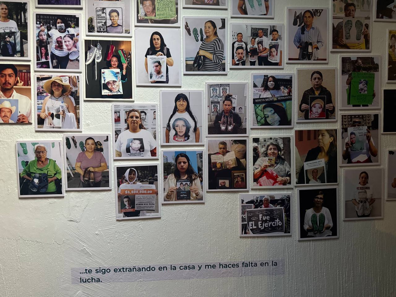 En las paredes también estaba una galería fotográfica proveniente del archivo del colectivo, donde se documentan marcha y los rostros de los familiares junto con la ficha de búsqueda de su ser querido. Cada imagen era un recordatorio visual de que las huellas no solo se imprimen en los zapatos, sino también en la historia colectiva del país.
