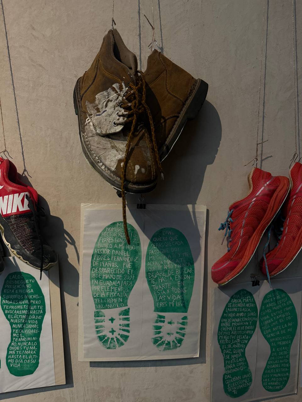 Frente a este contexto, para el colectivo Huellas de la Memoria la tarea fundamental ha sido mantener viva la memoria de las familias y de sus tesoros ausentes. Lo hacen a través de zapatos: huaraches, botas, tenis que alguna vez recorrieron la tierra junto a quienes hoy faltan y que ahora cargan, en sus suelas grabadas y gastadas, la huella de otra huella más profunda: la del amor de quienes buscan, la del reclamo de justicia, la de un país que no puede seguir caminando sin ellos. Cada par condensa memorias de esperanza y desconsuelo que nos interpelan.