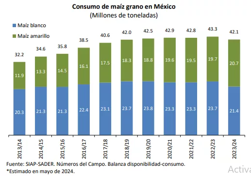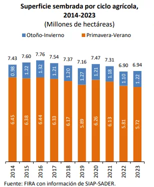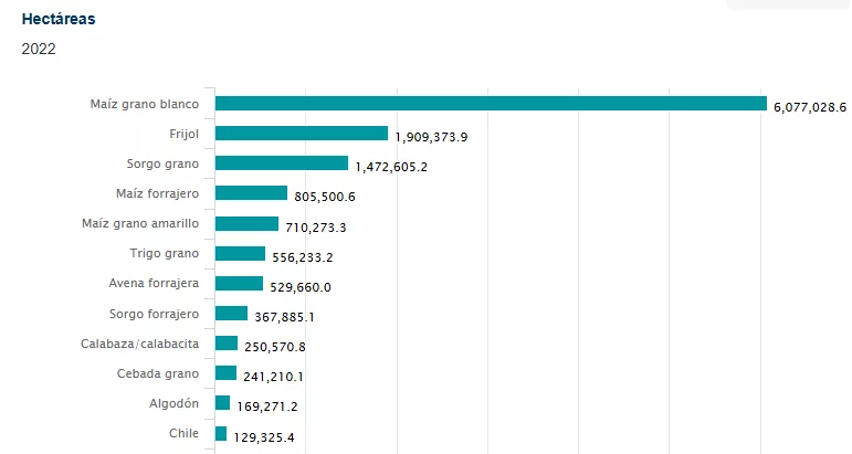 Por otra parte en Panorama Agroalimentario Maíz 2024, se mencionan cifras de acuerdo con SIAP-SADER, del año agrícola 2023, durante dicho periodo se sembraron 6.94 millones de hectáreas de maíz en México, es decir un 0.5 % mayor que el año anterior.