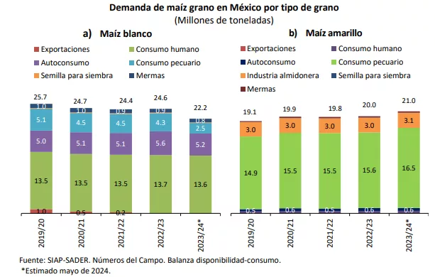 El maíz amarillo destaca en el consumo pecuario, con 74.5% del total, mientras que el maíz blanco, la mayor cantidad es de consumo humano, como la tortilla, alimento indispensable en la canasta básica de la población.