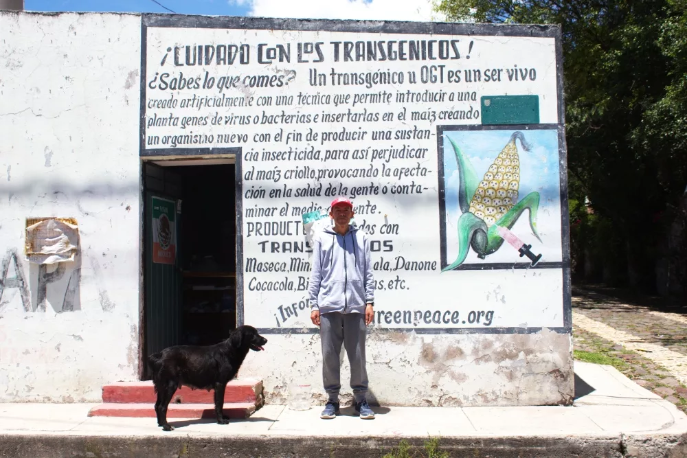 Enrique León, –habitante de Tequixquiac y vecino de la Colonia San Mateo- quien se dedica al comercio y al campo, comparte con su comunidad información acerca del daño de los transgénicos, por medio de la fachada de su papelería.