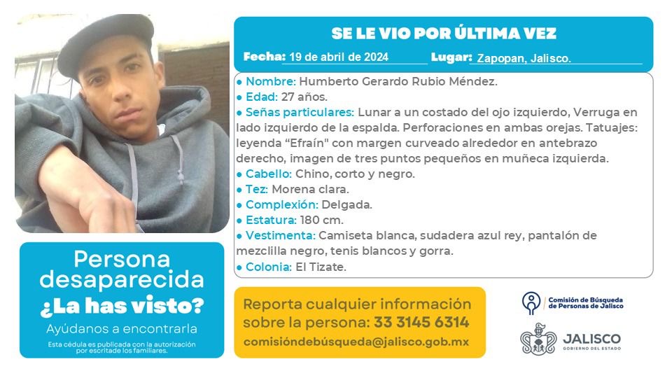 Humberto Gerardo Rubio Méndez fue desaparecido el 19 de abril de 2024 en Zapopan, Jalisco. Fue visto por última vez aquel viernes por la noche cuando salió de fiesta con uno de sus amigos. Eso es todo lo que su familia sabe hasta el momento.