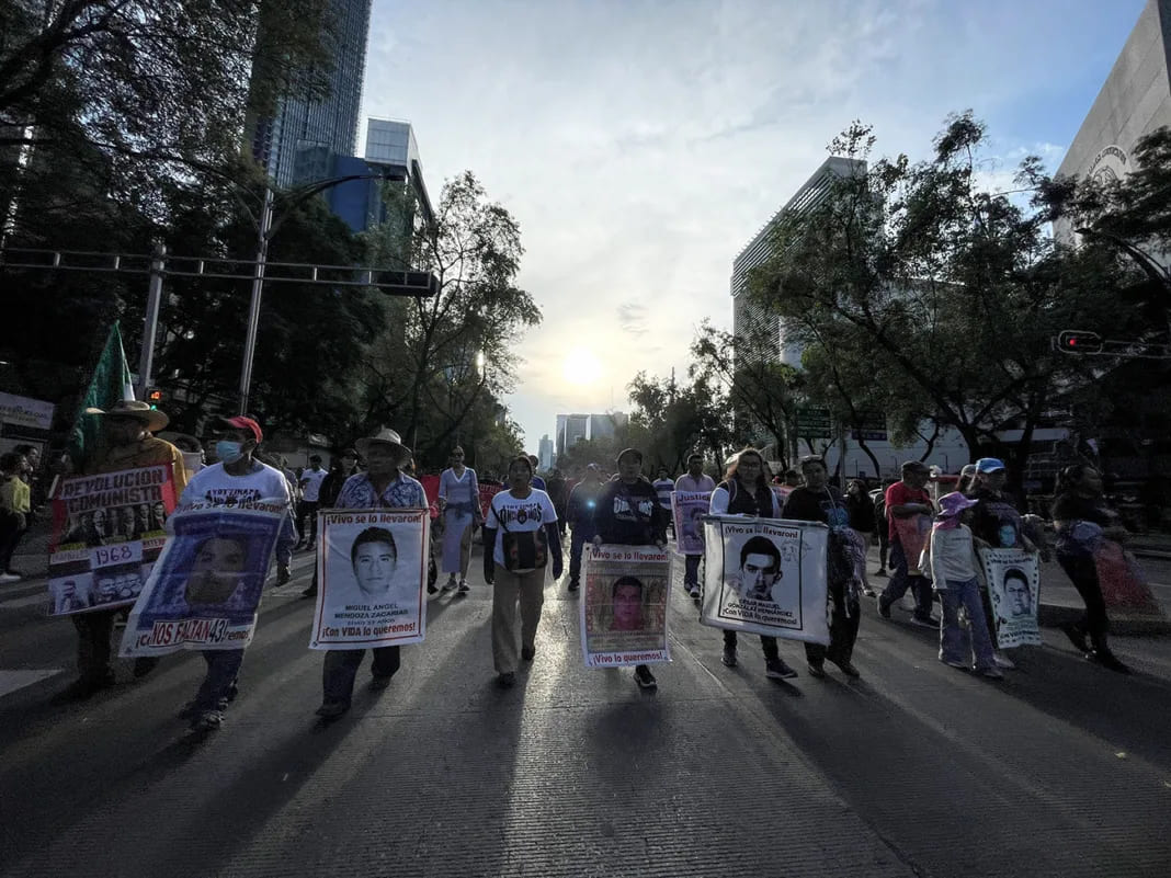 La marcha inició en el Ángel de la Independencia, encabezada por las familias que portaban las lonas con los rostros de sus hijos. Detrás de ellas se sumaron contingentes de normalistas, sindicatos, colectivas feministas, organizaciones sociales, la comunidad otomí y personas solidarias.
