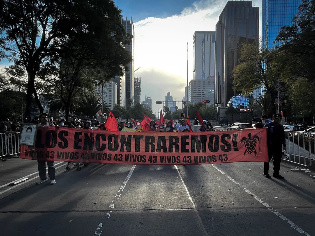 Mientras los contingentes avanzaban por Avenida Reforma, resonaban las consignas: “¡Ayotzi vive, la lucha sigue! ¡Por qué los asesinan si son la esperanza de América Latina! ¡AMLO decía que todo cambiaría, mentira, la misma porquería!”.