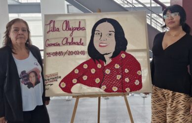 Foto de portada: Norma Andrade y Jade García Andrade posan con un bordado de Lilia Alejandra, en el marco de la exposición «Los pasos de Alejandra», realizada en su 24 aniversario luctuoso, el 14 de febrero de 2025 en la CDMX. / Crédito: Mely Arellano