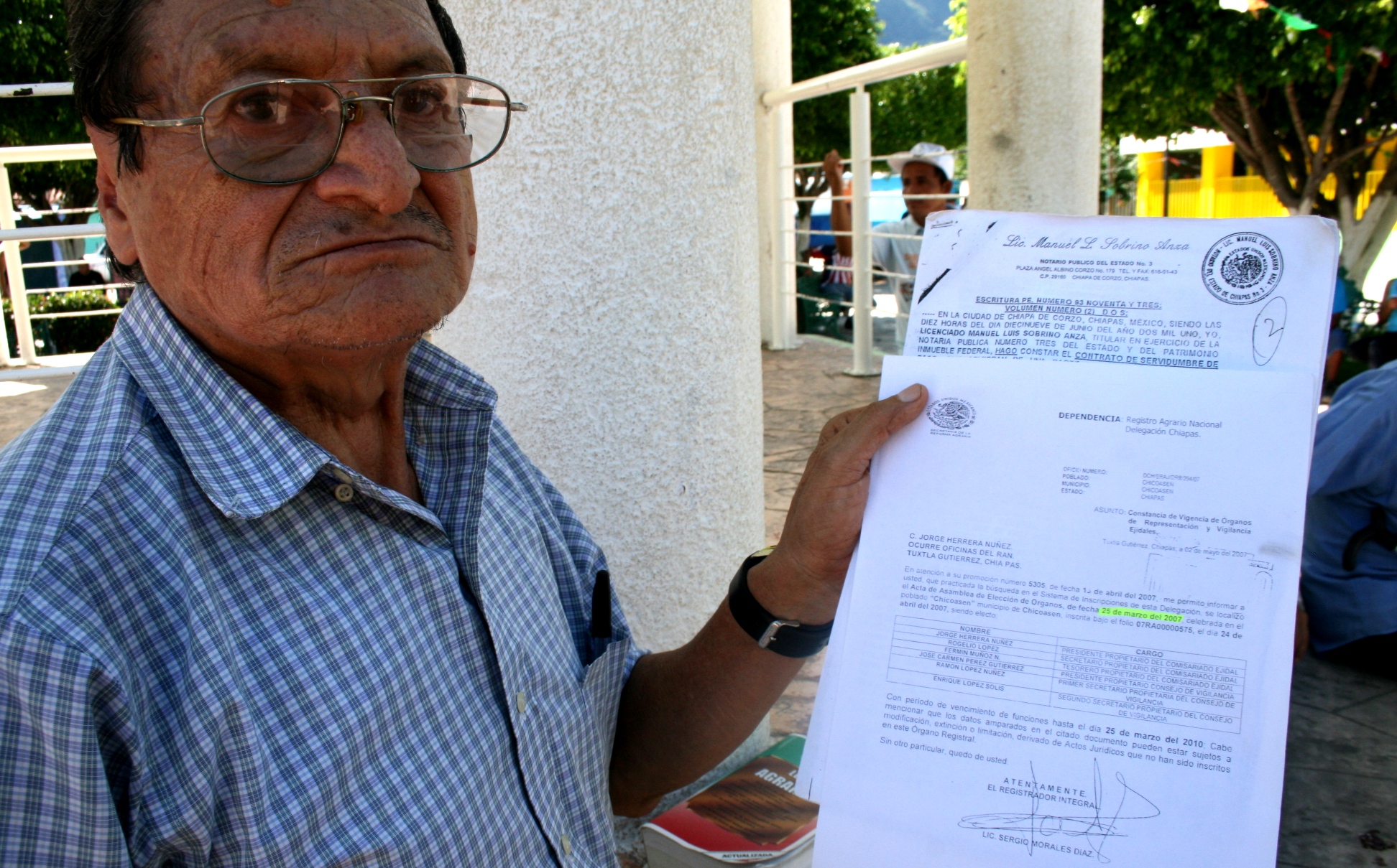 Don Avisaín Solís López exhibe documentos firmados por la CFE en los que se comprometió en 1985 pagar unas tierras afectadas con Chicoasén I y hasta la fecha no cumple. Foto: Isaín Mandujano/Chiapa PARALELO