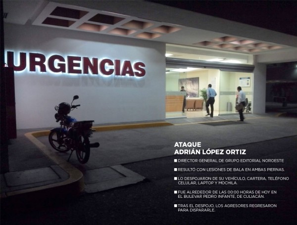 CULIACÁN._ Anoche, alrededor de las 00:00 horas, fue asaltado, golpeado y atacado de un balazo, el director general de Grupo Noroeste, Adrián López Ortiz, cuando se dirigía a su casa desde el Aeropuerto de Culiacán.En un ataque evidentemente planeado, con la participación de por lo menos dos vehículos, el director de esta casa editorial fue obstaculizado por un automóvil, mientras una camioneta le cerraba el paso, en el Bulevar Pedro Infante y Juan M. Zambada, a la altura de las vías del ferrocarril, en el sector Las Flores.