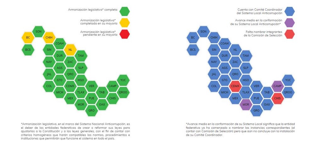Respecto a la conformación de las instancias, Chiapas y Ciudad de México, son los únicos estados que les falta nombrar integrantes de la Comisión de Selección. Por su parte, Morelos y Campeche tienen un avance medio de la confirmación del Sistema Local. Todos los demás estados, ya cuentan con su Comité Coordinador.