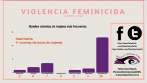 En el mes de marzo del 2020 se registraron once muertes de mujeres, dentro de estas destacan 2 homicidios, 4 suicidios, 2 por causas de fuerza mayor y 3 feminicidios. La última cifra es un dato mínimo, los suicidios sospechosos sin carta póstuma podrían cubrir un feminicidio, menciona el Observatorio Feminista.