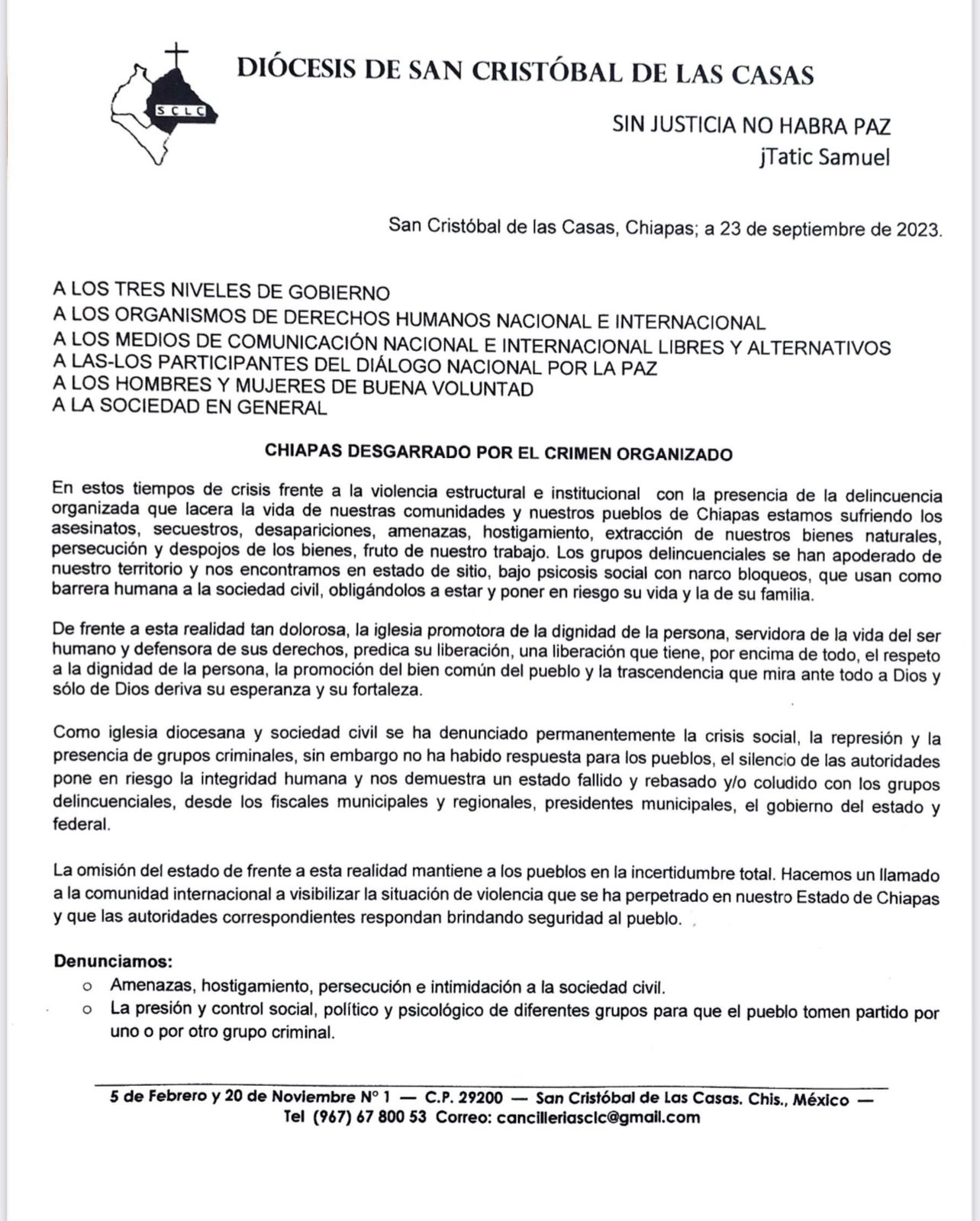 También la Diócesis de Tapachula se pronunció. En un comunicado dirigido a los tres niveles de gobierno, ambas Diócesis detallan: el estado vive “tiempos de crisis frente a la violencia estructural e institucional con la presencia de la delincuencia organizada que lacera la vida de las comunidades y los pueblos de Chiapas están sufriendo los asesinatos, secuestros, desapariciones, amenazas, hostigamiento, extracción de nuestros bienes naturales, persecución y despojos de los bienes, fruto de su trabajo”.