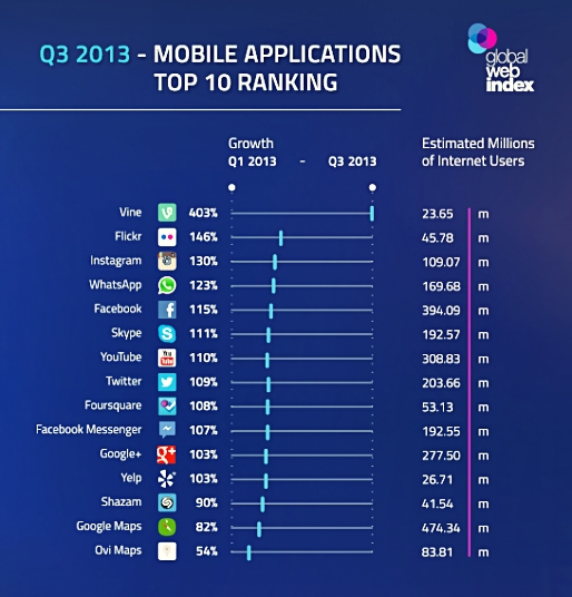 Entre las más destacadas se encuentra Vine, una app que pese al impacto que sufrió con laincorporación de video en Instagram ha llegado a expandirse un 403% solo hasta octubre.